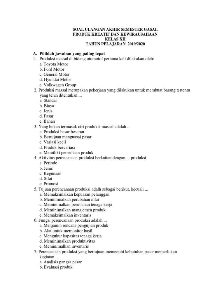 Sekian draft soal yang dapat saya bagikan. Semoga bisa bermanfaat bagi sahabat klinik sekalian. Untuk mendapatkan soal ulangan akhir semester (uas) produk kreatif dan kewirausahaan kelas xii smk pilihan ganda dan esay silahkan unduh filnya yang sudah kami kemas dalam bentuk pdf di bawah ini. Mar 19, 2021 · soal pkk kelas 12 smk merupakan file contoh berkas guru yang bisa digunakan untuk melengkapi semua keperluan administrasi guru di sekolah yang berhubungan dengan kelas, soal, dan bisa juga di gunakan sebagai bahan perbandingan atau referensi yang sesuai dengan keperluan guru dan sekolah agar lebih mudah dalam membuat dan mengelola semua kelengkapan administrasi guru di sekolah, untuk lebih jelasnya silahkan disimak ulasan dan referensi tentang file soal pkk kelas 12 smk dibawah ini: Nov 02, 2020 · demikianlah soal latihan uas / pas pkn /ppkn kelas 12/ xii jenjang sma/ma semester 1 kuirkulum 2013 yang dapat saya bagikan, semoga bermanfaat.